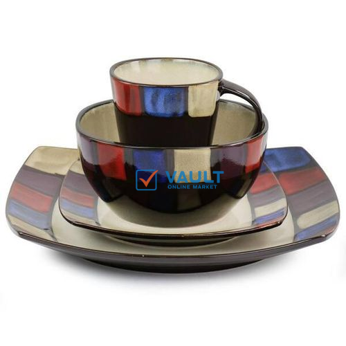 24 Pieces Of Checked Square Plates Cups Sideplates Bowls Dinnerware Set - Multicolored