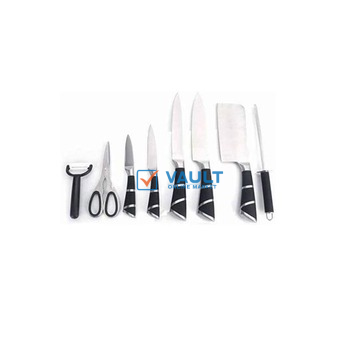 • Includes 1 x meat cleaver, 1 x chef knife, 1 x utility knife, 1 x paring knife, 1 x kitchen scissors and sharpening rod