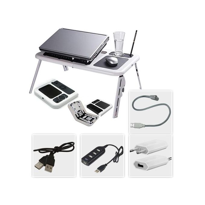 • Adjustable laptop table and iPad stand with built-in cooling system (2 USB cooling fan), a mouse platform and place for pen and cup.